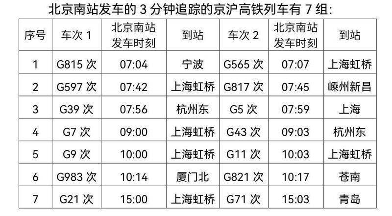 据北京南站介绍七星策略,今日起,北京南站京沪高铁增开列车4对,分别是去往上海方向的G1/G32次和G35/G2次、去往杭州方向的G43/G42次,以及去往开化方向的G743/G744次,至此京沪高铁图定列车达到140对。当日,北京南站增加覆盖早晚高峰时段的京沪高铁达速列车,G1次开行时间为6:30;G35次开车时间为19:24;G32次到达时间为23:49;更加方便当日北京、上海两地间旅客往返。